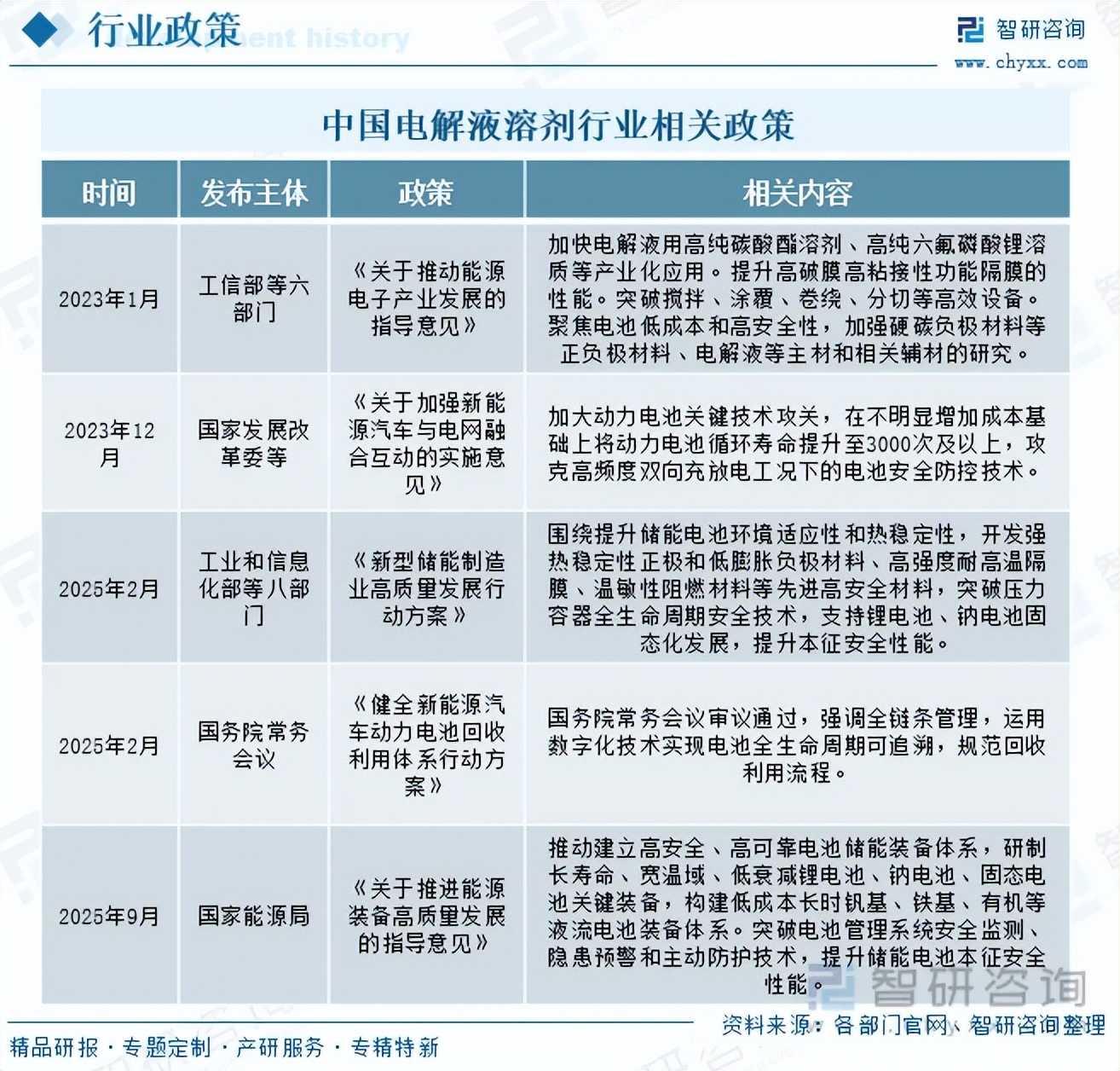 注:本文节选出自智研咨询发布的《2025年中国电解液溶剂行业政策、产业链全景、发展现状、重点企业及未来发展趋势研判:政策市场双向加持,电解液溶剂景气高涨[图]》行业分析文章,如需获取行业文章全部内容,可进入智研咨询搜索查看。