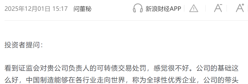 “看到证监会对其负责人的可转债交易处罚,感觉很不好。”这位投资者称。