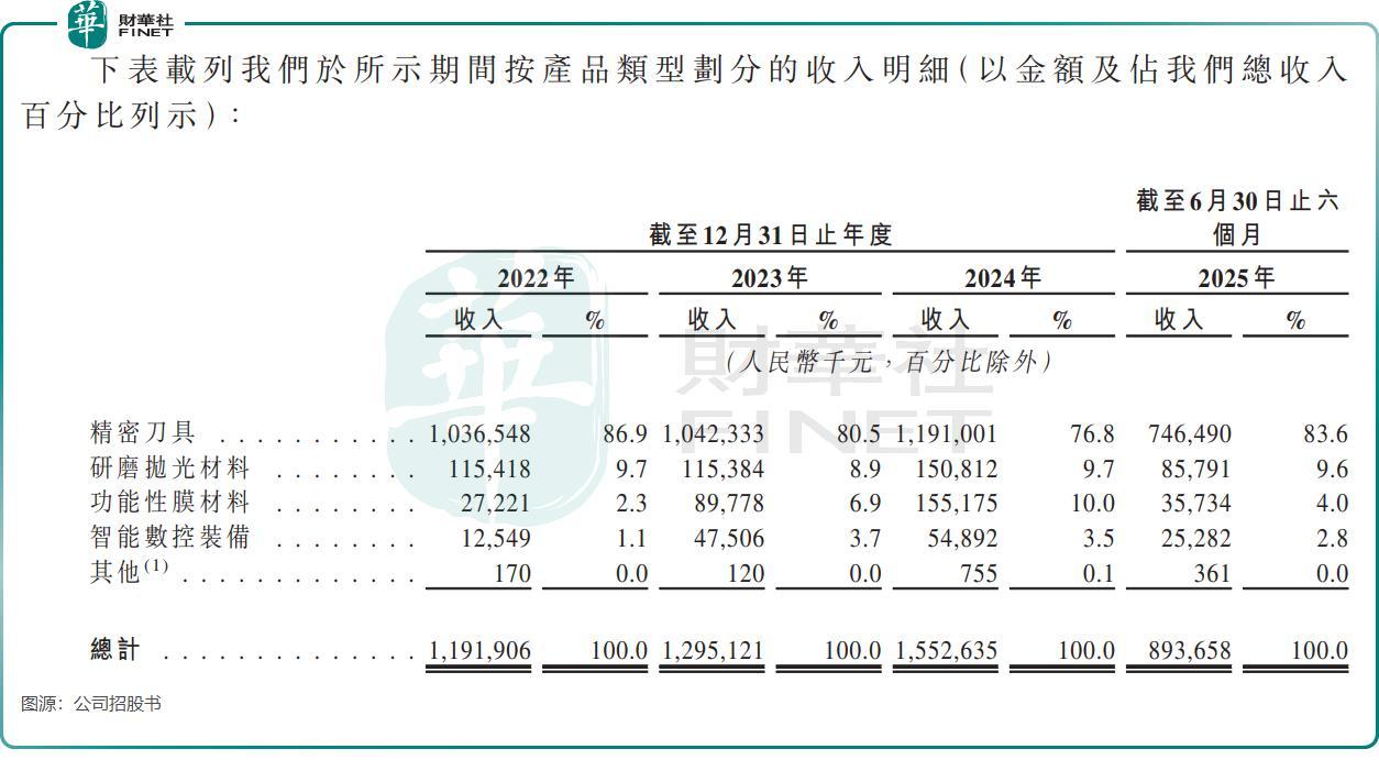 公司实现了“工具+材料+装备”全产品线布局,产品组合涵盖四大类,包括精密刀具、研磨抛光材料、功能性膜材料、智能数控装备。这些产品服务于AI服务器、具身机器人、半导体及集成电路相关应用、低轨卫星通信、高端装备制造及智能汽车,以及消费电子、通讯及工业控制等行业。