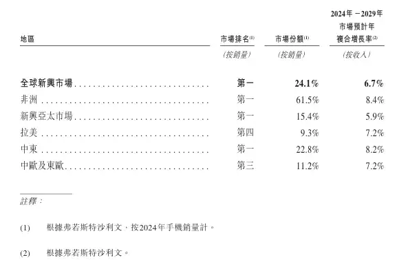 根据弗若斯特沙利文,以2024年手机销量计,公司在非洲排名第一,市场份额为61.5%。在新兴亚太市场及中东亦均排名第一,市场份额分别为15.4%及22.8%。