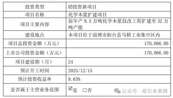 为优化现有原材料产品结构,进一步提高原料与产品的多样化程度,山东博汇纸业股份有限公司(以下简称“公司”)近日宣布重大项目规划:将在现有厂区内依托已有生产线,实施年产32万吨化学浆改扩建项目。该项目总投资达170,066万元,建成后公司化学木浆产能将实现大幅跃升。