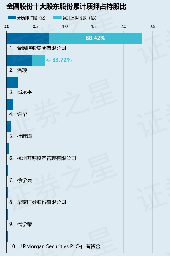截止本公告日,股东金圆控股集团有限公司已累计质押股份1.59亿股,占其持股总数的68.42%,股东潘颖已累计质押股份2230.0万股,占其持股总数的33.72%。本次质押后金圆股份十大股东的累计质押股份占持股比例(占持股比例的计算以公司最新一期财务报表公布的十大股东的持股总数为基准)见下图:
