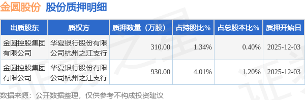 证券之星消息,金圆股份(维权)(000546)12月4日公开信息显示,股东金圆控股集团有限公司向华夏银行股份有限公司杭州之江支行合计质押1240.0万股,占总股本1.6%。质押详情见下表: