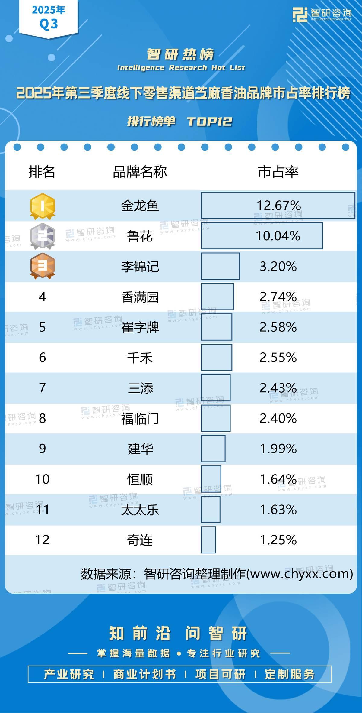 导语:近日,2025年第三季度线下零售渠道芝麻香油品牌市占率分析简报正式发布。数据显示,金龙鱼凭借其强大的品牌影响力与渠道优势,在芝麻香油市场占据领先地位。本次品牌市占率榜单是智研咨询基于全国线下零售渠道真实销售数据,测算得出的,覆盖主流芝麻香油品牌,为行业提供了权威的市场参考。