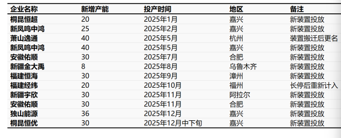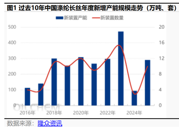 2025年,国内涤纶长丝行业新增产能规模重新回到年投产新装置300万吨上下的规模水平,其中龙头企业占据产能增长的绝对多数,差异化纤维占据新增产能近7成份额。