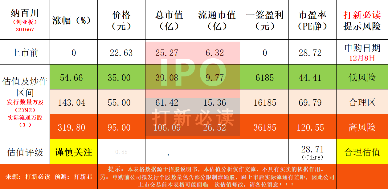 【预测表格说明】:中间淡黄色为打新君预测首日可能的合理价格,绿色为未来低风险区间【特别注意:对于质地不错的公司,绿色价格预期,这需要看当时的市场环境变化)。全面注册制后,合理、高、低风险区间表示前五天可能面临的价格,其中低风险区预示价值凸显,高风险区间为炒作风险区间;而随着注册制时间越久,高低风险价格越来越趋向未来的一段时间的价格,而合理价格更具有新股溢价问题的指引作用。【提示说明】:本表格数据源于招股说明书,申购前公司拟发行个股数量包含部分限制流通股,跟上市后实际流通有差距,因此公司上市交易前本表格可能面临二次估值修改,请各位留意!!!$纳百川(301667)