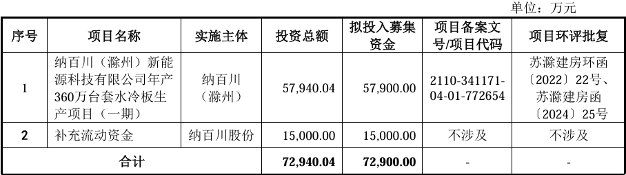 本此拟募资用途:项目总投资资金7.29亿,其中5.79亿用于纳百川(滁州)新能源科技有限公司年 产360万台套水冷板生产项目(一期),1.5亿用于补充流动性资金,具体项目如下: