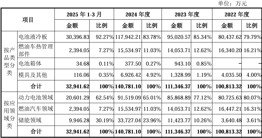 电池液冷板:公司最核心的产品,用于新能源汽车动力电池包及储能系统的精准温控,其销售收入常年占主营业务收入的80%以上。2025年第一季度,该产品销售收入占比进一步提升至92.27%。