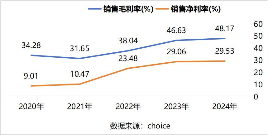 更引人注目的业绩亮点在于其盈利能力的显著跃升。2024年,公司毛利率高达48.17%,净利率亦达到29.53%的优异水平。在业务规模快速扩张的同时,盈利能力实现同步进阶,形成了“规模增长”与“利润提升”相互促进的良性发展格局,不仅为企业的长期可持续发展筑牢根基,也彰显出强劲的未来成长潜力。