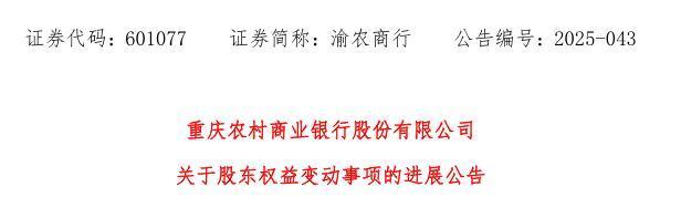 12月3日,渝农商行发布公告称,农投集团股权无偿划转涉及的市场监督管理局备案手续已办理完成。