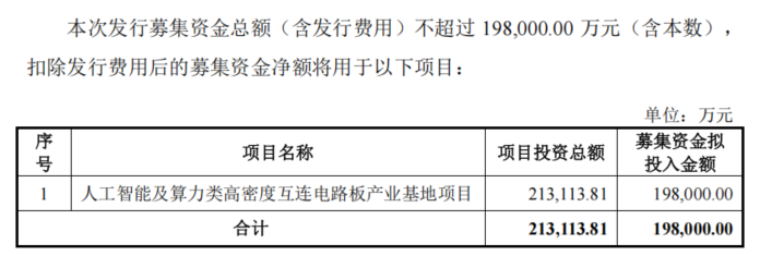 本次向特定对象发行股票的募集资金总额(含发行费用)不超过19.8亿元(含本数),扣除发行费用后募集资金将用于人工智能及算力类高密度互连电路板产业基地项目。