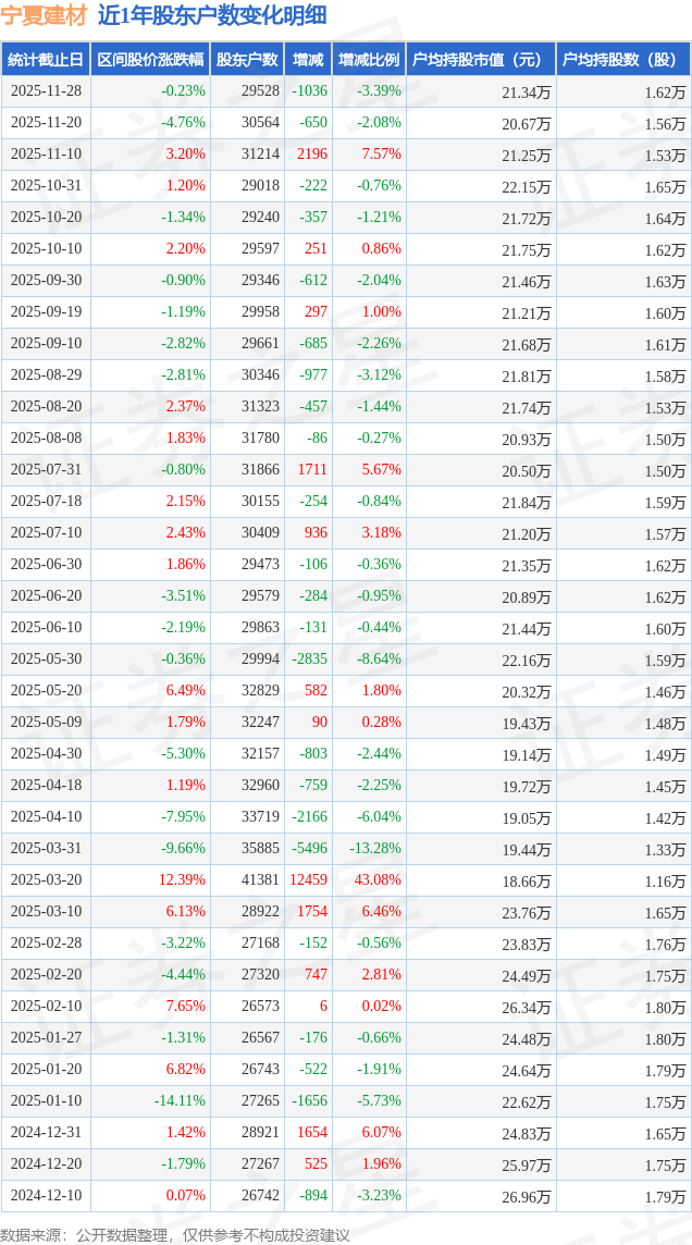 从股价来看,2025年11月20日至2025年11月28日,宁夏建材区间跌幅为0.23%,在此期间股东户数减少1036.0户,减幅为3.39%。