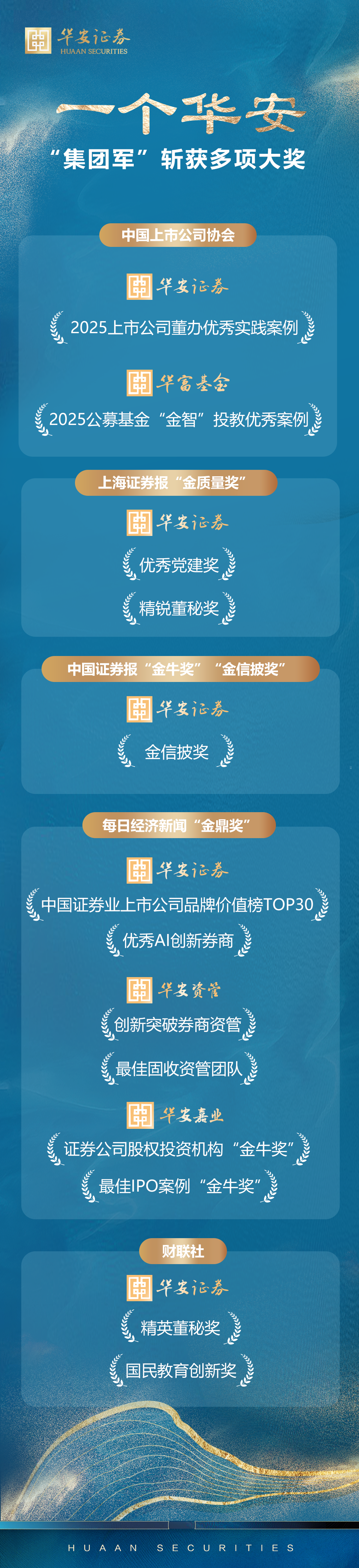 近期,华安证券及其子公司华安资管、华安嘉业、华富基金在一批高质量行业大奖中集体亮相,又接连斩获十多个行业重磅奖项,涵盖党的建设、公司治理、信息披露、资产管理、股权投资、数字金融、品牌创新等多个维度,展现出华安证券作为一支协同作战的“金融集团军”的市场认可度。