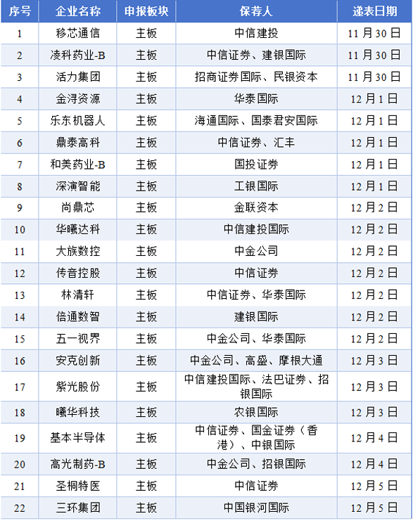 11月30日至12月6日期间移芯通信、凌科药业-B、活力集团、金浔资源、乐动机器人、鼎泰高科、和美药业-B、深演智能、尚鼎芯、华曦达、大族数控、传音控股、林清轩、倍通数智、五一视界、安克创新、紫光股份、曦华科技、基本半导体、高光制药-B、圣桐特医、三环集团向港交所递交上市申请,其中鼎泰高科、大族数控、传音控股、安克创新、紫光股份、三环集团已登陆A股,此次冲击“A+H”两地上市。