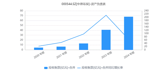 在市场极为关注的应收账款方面,近年来,中原环保应收账款规模呈现上涨之势。2020年-2024年及今年三季度末,其应收账款余额分别为4.58亿元、6.66亿元、13.13亿元、41.06亿元、67.86亿元和89.65亿元。