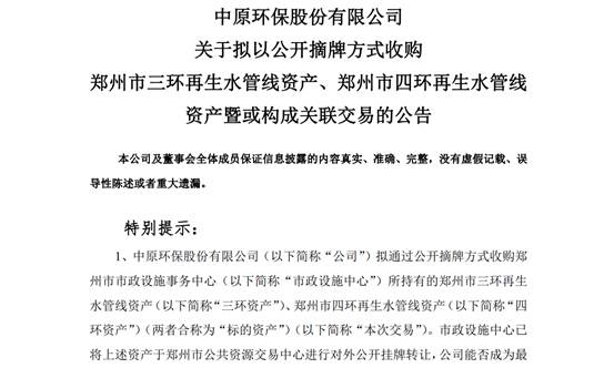 12月5日,中原环保(000544)发布公告称,拟通过公开摘牌方式收购郑州市三环、四环再生水管线资产,本次交易以挂牌价格(即评估值)14.58亿元为基准价格,采用竞价方式进行。