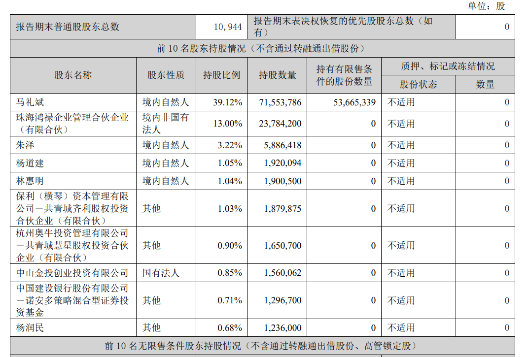截至2025年9月30日,马礼斌直接持有公司股份7155.38万股,占总股本的39.12%,其中有限售条件股份5366.53万股。