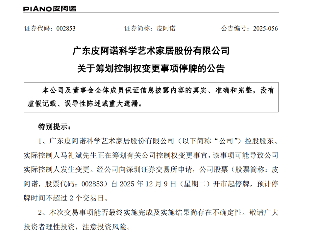 12月8日晚,广东皮阿诺科学艺术家居股份有限公司(股票简称:皮阿诺,股票代码:002853)突发停牌公告。公司称,控股股东、实际控制人马礼斌正在筹划控制权变更事宜,可能导致公司实际控制人发生变更。股票自2025年12月9日开市起停牌,预计停牌时间不超过2个交易日。