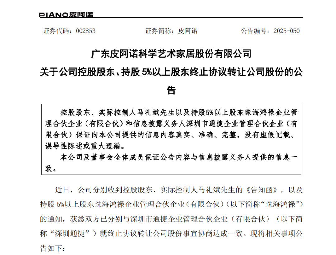 珠海鸿禄和深圳通捷也于2025年11月14日签署了《关于广东皮阿诺科学艺术家居股份有限公司之股份转让协议之终止协议》。