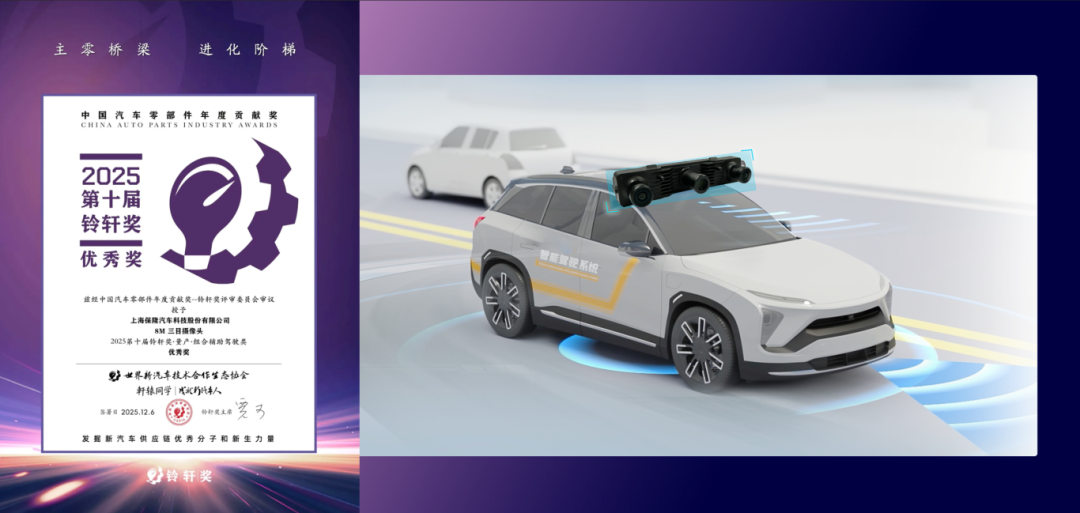 12月6日,2025第十届铃轩奖颁奖典礼在苏州举行,保隆科技的 “8M三目摄像头” 荣获 “第十届铃轩奖-量产类-组合辅助驾驶类优秀奖”。保隆科技高级副总裁文剑峰参会并代表公司领奖。此次获奖,体现了行业评委会对保隆科技摄像头最新技术的充分肯定,彰显了保隆科技在组合辅助驾驶领域优秀的技术实力。