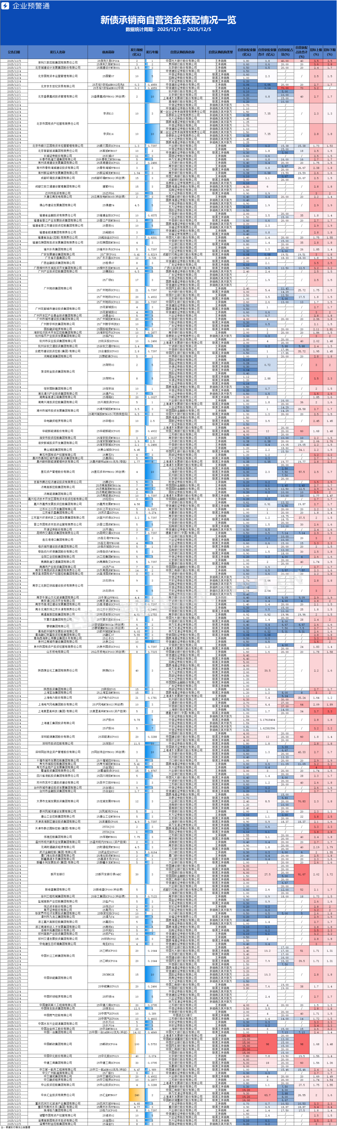 据企业预警通统计,2025年12月1日至5日期间,共有294只新发行债券披露了承销商自营认购信息,涉及发行人179家,发行总规模达1729.39亿元;其中,承销商自营获配规模合计542.62亿元。