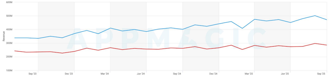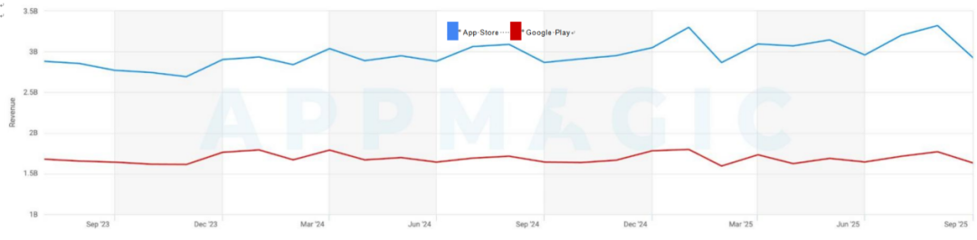 在全球移动游戏市场的结构性增长中,策略类游戏无疑是重要的增长引擎。AppMagic报告显示,自2024年中期以来,策略类游戏市场呈现出平稳且强劲的增长态势。整体市场方面,各大平台均实现20%—28%的均衡增幅,2024年10月至2025年9月总收入从108亿美元增长至135亿美元,同比增幅达25.55%,远超全球市场3.4%的平均增速。