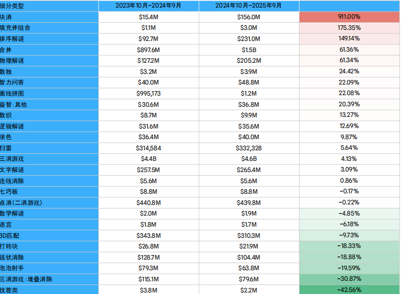 其中,合并类游戏收入同比涨幅高达61.36%,规模从8.98亿美元增长至15亿美元。其易于上手,且兼具策略与满足感,吸引了庞大的泛用户群体,且生命周期更长,成为休闲游戏市场的重要增长极。