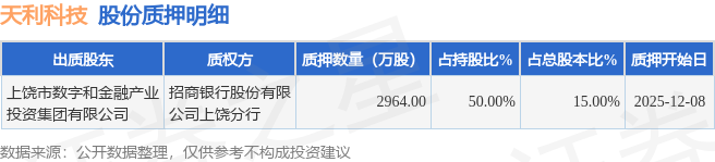 证券之星消息,天利科技(300399)12月9日公开信息显示,股东上饶市数字和金融产业投资集团有限公司向招商银行股份有限公司上饶分行合计质押2964.0万股,占总股本15.0%。质押详情见下表: