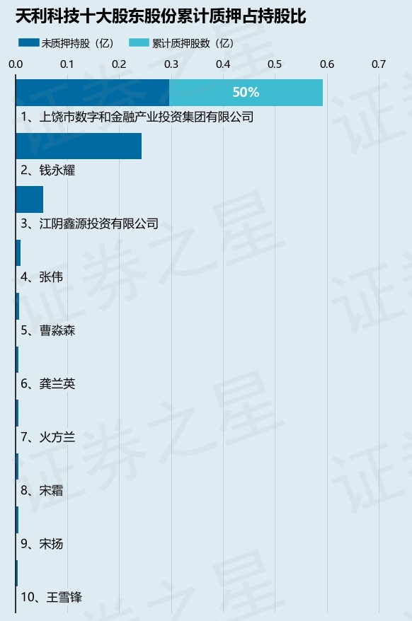 截止本公告日,股东上饶市数字和金融产业投资集团有限公司已累计质押股份2964.0万股,占其持股总数的50.0%。本次质押后天利科技十大股东的累计质押股份占持股比例(占持股比例的计算以公司最新一期财务报表公布的十大股东的持股总数为基准)见下图: