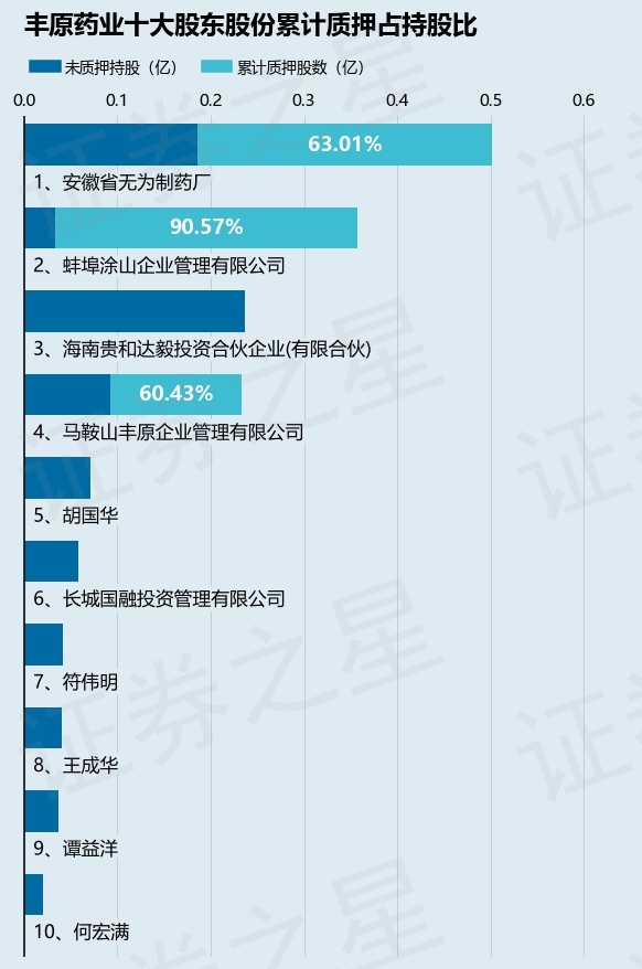 截止本公告日,股东安徽省无为制药厂已累计质押股份3162.0万股,占其持股总数的63.01%,股东蚌埠涂山企业管理有限公司已累计质押股份3236.0万股,占其持股总数的90.57%,股东马鞍山丰原企业管理有限公司已累计质押股份1412.0万股,占其持股总数的60.43%。本次质押后丰原药业十大股东的累计质押股份占持股比例(占持股比例的计算以公司最新一期财务报表公布的十大股东的持股总数为基准)见下图:
