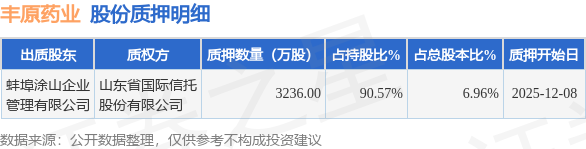 证券之星消息,丰原药业(000153)12月9日公开信息显示,股东蚌埠涂山企业管理有限公司向山东省国际信托股份有限公司合计质押3236.0万股,占总股本6.96%。质押详情见下表: