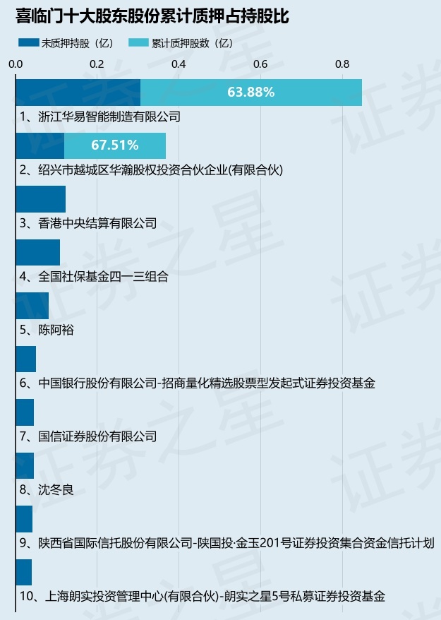 截止本公告日,股东浙江华易智能制造有限公司已累计质押股份5417.0万股,占其持股总数的63.88%,股东绍兴市越城区华瀚股权投资合伙企业(有限合伙)已累计质押股份2485.0万股,占其持股总数的67.51%。本次质押后喜临门十大股东的累计质押股份占持股比例(占持股比例的计算以公司最新一期财务报表公布的十大股东的持股总数为基准)见下图: