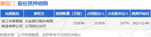 证券之星消息,喜临门(603008)12月9日公开信息显示,股东浙江华易智能制造有限公司向兴业银行股份有限公司绍兴分行合计质押1350.0万股,占总股本3.67%。质押详情见下表: