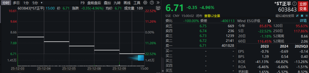 12月9日,*ST正平(维权)(603843)股价再次上演“一字”跌停,这已是该股股价自12月3日复牌以来第5个“一字”跌停。