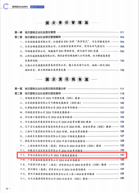 12月5日,国务院国资委社会责任局在京举办中央企业和地方国资国企社会责任蓝皮书发布会,凭借在环境、社会与治理(ESG)领域的卓越实践,华安证券《2024可持续发展报告》从全国数百份报告中脱颖而出,入选国务院国资委地方国有企业社会责任报告案例,成为全国范围内20家入选单位之一。