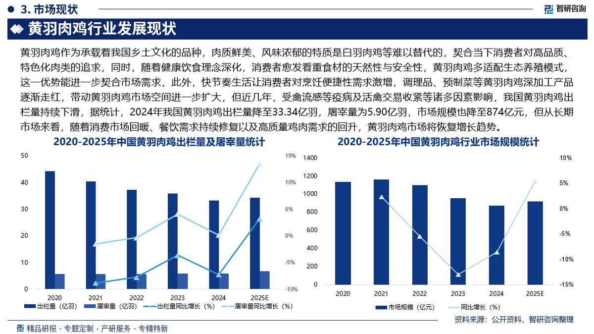 出栏量:近几年,受禽流感等疫病及活禽交易收紧等诸多因素影响,我国黄羽肉鸡出栏量持续下滑,据统计,2024年我国黄羽肉鸡出栏量降至33.34亿羽,屠宰量为5.90亿羽,市场规模也降至874亿元,但从长期市场来看,随着消费市场回暖、餐饮需求持续修复以及高质量鸡肉需求的回升,黄羽肉鸡市场将恢复增长趋势。