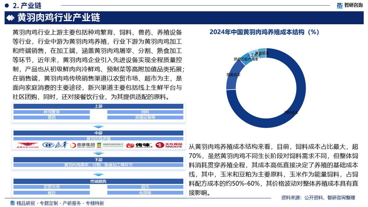 产业链核心节点:黄羽肉鸡行业上游主要包括种鸡繁育、饲料、兽药、养殖设备等行业,行业中游为黄羽肉鸡养殖,行业下游为黄羽肉鸡加工和终端销售,在加工端,涵盖黄羽肉鸡屠宰、分割、熟食加工等环节,近年来,黄羽肉鸡企业引入先进设备实现全程质量控制,产品也从初级鲜肉向冷鲜鸡、预制菜等高附加值品类拓展;在销售端,黄羽肉鸡传统销售渠道以农贸市场、超市为主,是面向家庭消费的主要途径,新兴渠道主要包括线上生鲜平台与社区团购,同时,还对接餐饮行业,为其提供适配不同烹调需求的原料。