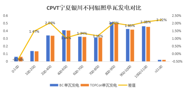宁夏银川是典型的太阳能资源一类地区,年均辐照度超500W/㎡,辐照时长超2000小时,是光伏组件性能测试的绝佳之处。在这里,隆基绿能委托三方权威机构国家光伏质检中心(CPVT)对BC 2.0组件与常规TOPCon组件进行了为期7个月的户外发电实证。该项目系统评估了两类技术路线产品在无遮挡单瓦发电能力、不同辐照度下的发电表现、各时段的发电稳定性,以及遮挡条件下的发电情况,旨在真实反应其在现实环境下的综合性能差异。