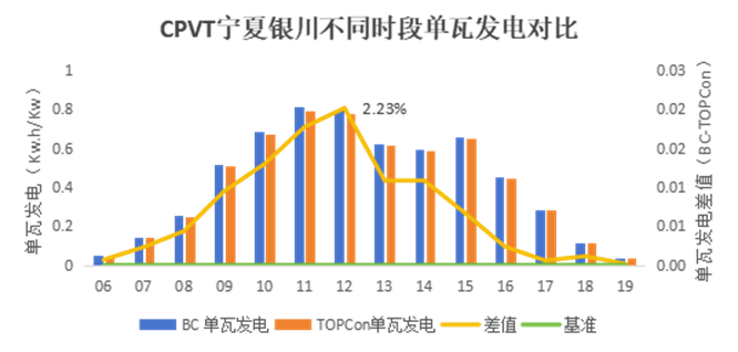 特定时段优势显著:对单日发电曲线的分析发现,在上午11时至12时的时间段,BC组件的单瓦发电增益最为突出,达到2.23%,显示其对该时段高强光照的高效利用能力。