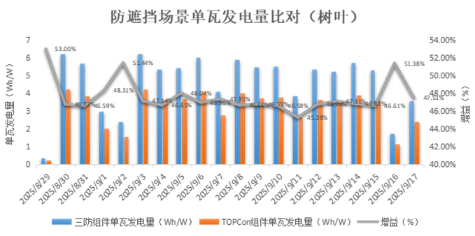 本次实证还模拟了光伏真实工作环境中经常遇到的树叶鸟粪遮挡场景(即单片电池遮挡),在此特殊条件下,隆基BC组件凭借“弱导通”功能,实现单瓦直流发电量超出常规TOPCon组件47.12%,差距惊人。