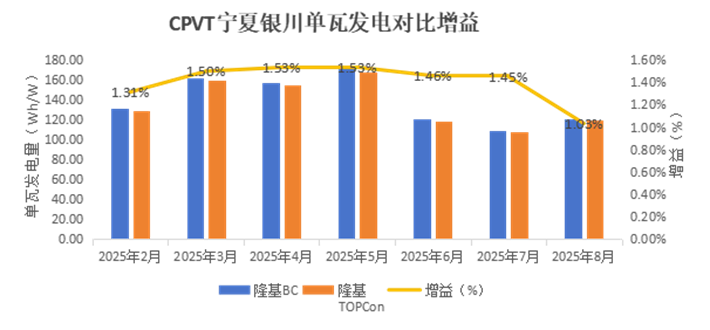全天稳定增益:在整个白天的发电周期内,BC组件的单瓦发电量增益平均值稳定在1.44%,印证其在多变光照条件下持续、可靠的发电表现。