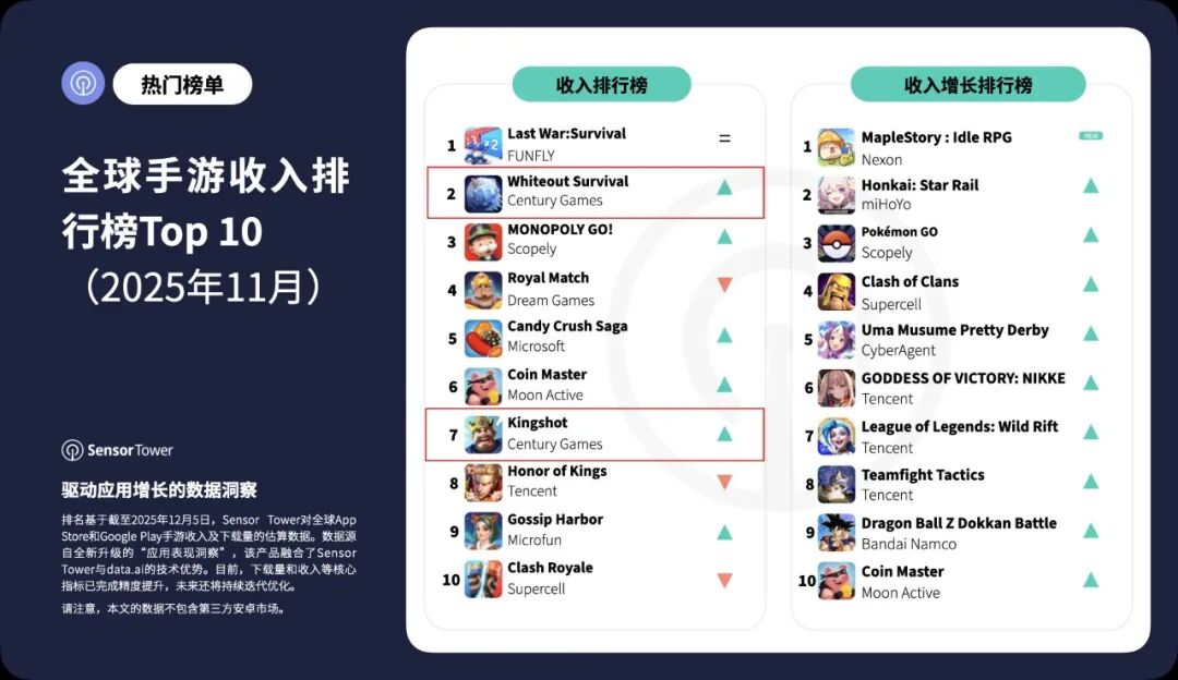 旗舰产品《Whiteout Survival》从第5跻身至第2位,而新作《Kingshot》则从第8稳步提升至第7位——这是12月10日第三方机构Sensor Tower最新发布的11月全球手游收入与下载量排行榜——意即在全球范围内,世纪华通(维权)的产品在TOP7里占了俩。与此同时,旗下Century Games依然稳居11月中国手游发行商全球收入榜亚军。上述优异的表现,进一步印证了董事长王佶近期对公司“是一家移动业务主导、全球化收入名列前茅且兼具规模与高成长性的游戏企业”的定位。