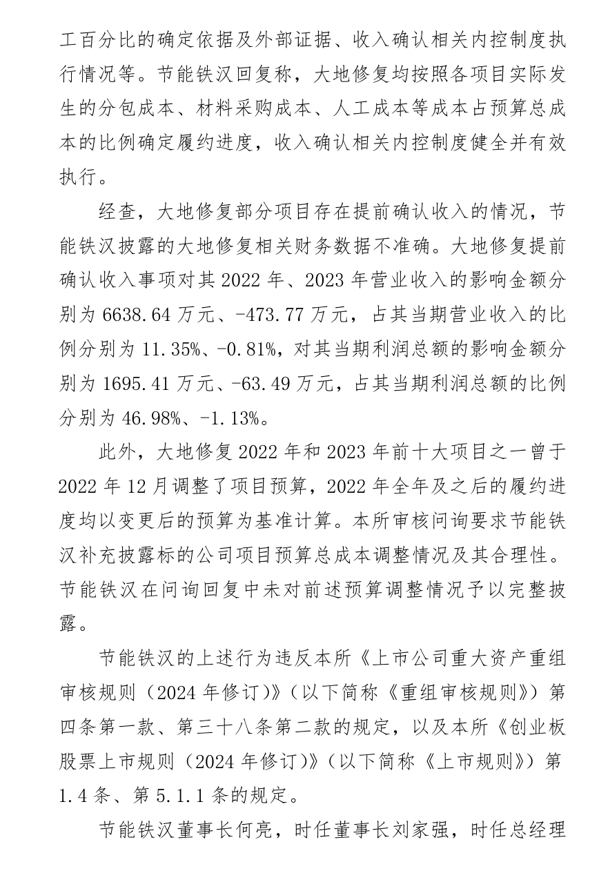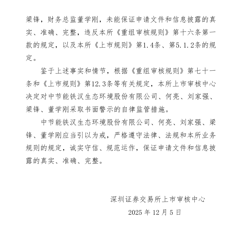 12月5日,深交所下发监管函,对节能铁汉及董事长何亮、时任董事长刘家强、时任总经理梁锋、财务总监董学刚下发监管函,指出公司在重大资产重组过程中存在信息披露违规行为,涉及标的公司提前确认收入及财务数据不准确等问题。深交所决定对公司及董事长何亮、时任董事长刘家强、时任总经理梁锋、财务总监董学刚采取书面警示的自律监管措施。