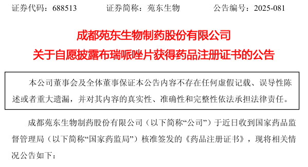 成都苑东生物制药股份有限公司(股票简称:苑东生物,股票代码:688513)是一家以研发创新驱动,集化学原料药、高端化学药及生物药研发、生产、销售于一体的高新技术企业,创立于2006年,于2020年在上海证券交易所科创板挂牌上市。苑东生物此次获批是国内首家按新注册分类获批的仿制药,视同通过一致性评价。