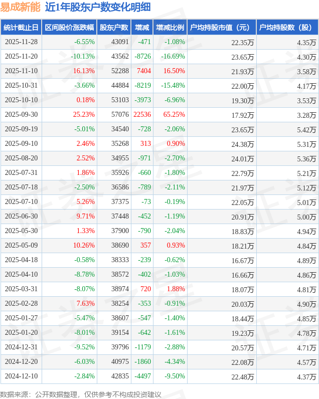 从股价来看,2025年11月20日至2025年11月28日,易成新能区间跌幅为6.55%,在此期间股东户数减少471.0户,减幅为1.08%。
