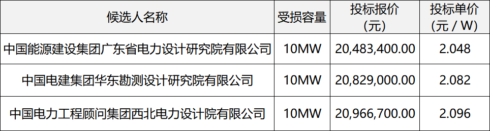 中标候选人:中国能源建设集团广东省电力设计研究院有限公司,投标报价:20483400.00元;中标候选人:中国电建集团华东勘测设计研究院有限公司,投标报价:20829000.00元;中标候选人:中国电力工程顾问集团西北电力设计院有限公司,投标报价:20966700.00元。