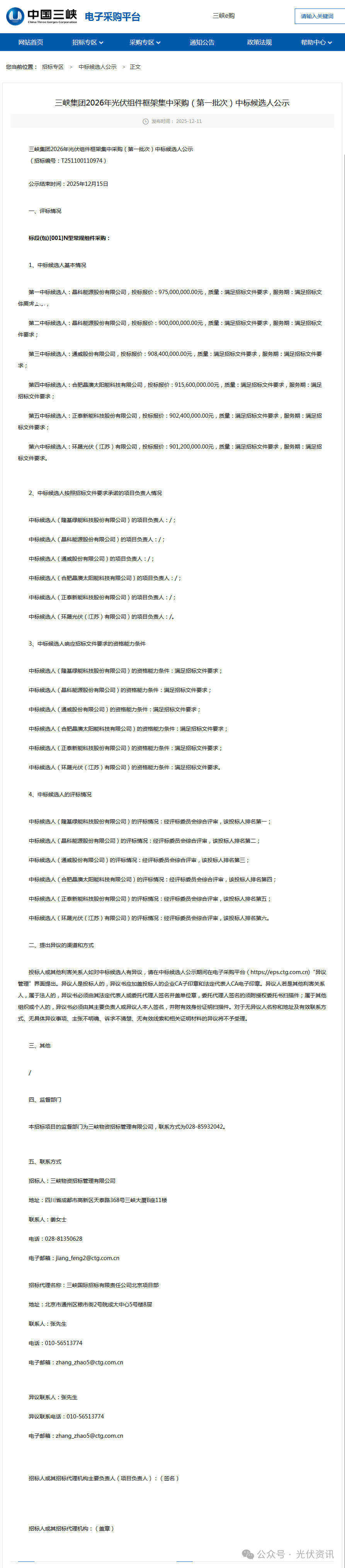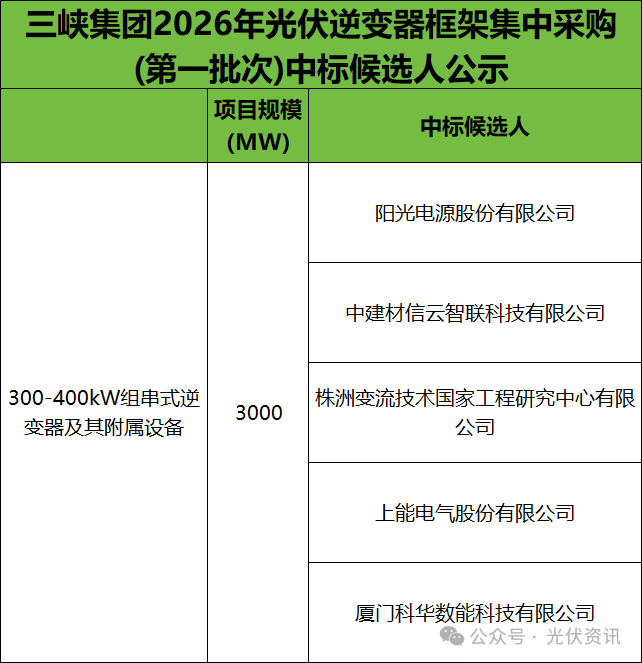 12月10日,三峡集团2026年光伏逆变器框架集中采购(第一批次)中标候选人公示。