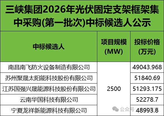 12月11日,三峡集团2026年光伏固定支架框架集中采购(第一批次)中标候选人公示,入围企业共计5家:南昌南飞防火设备制造有限公司、苏州聚晟太阳能科技股份有限公司、江苏国强兴晟能源科技股份有限公司、云南华国科技有限公司、宁夏龙祥新能源科技有限公司。