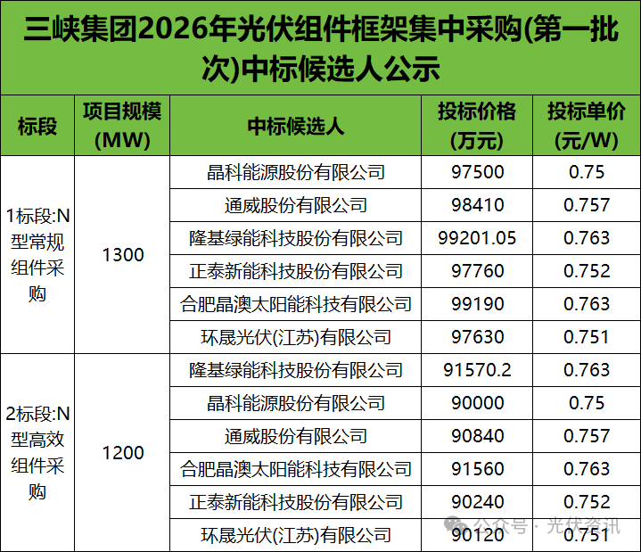 根据名单显示,此次共有6家光伏组件企业入围,分别是:隆基绿能、通威股份、晶科能源、合肥晶澳、环晟光伏、正泰新能,投标单价在0.75-0.763元/W,平均单价为0.756元/W。