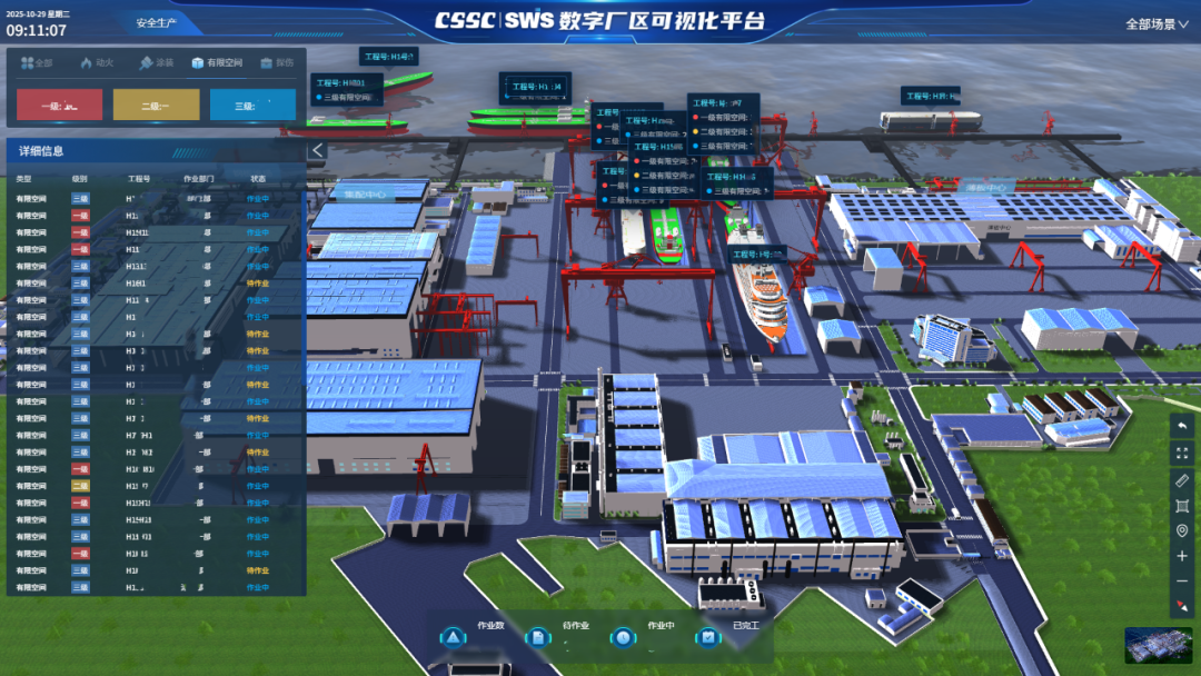2025年10月,外高桥造船发布数字孪生船厂1.0,在SWS TIME深度应用的基础上构建完整的船厂数字沙盘,集成数字孪生薄板车间、智能立库、钢板堆场等核心生产单元,构建全流程虚实融合体系,提升生产流程透明度,实现生产过程的精细化管控,赋能智能造船新生态。